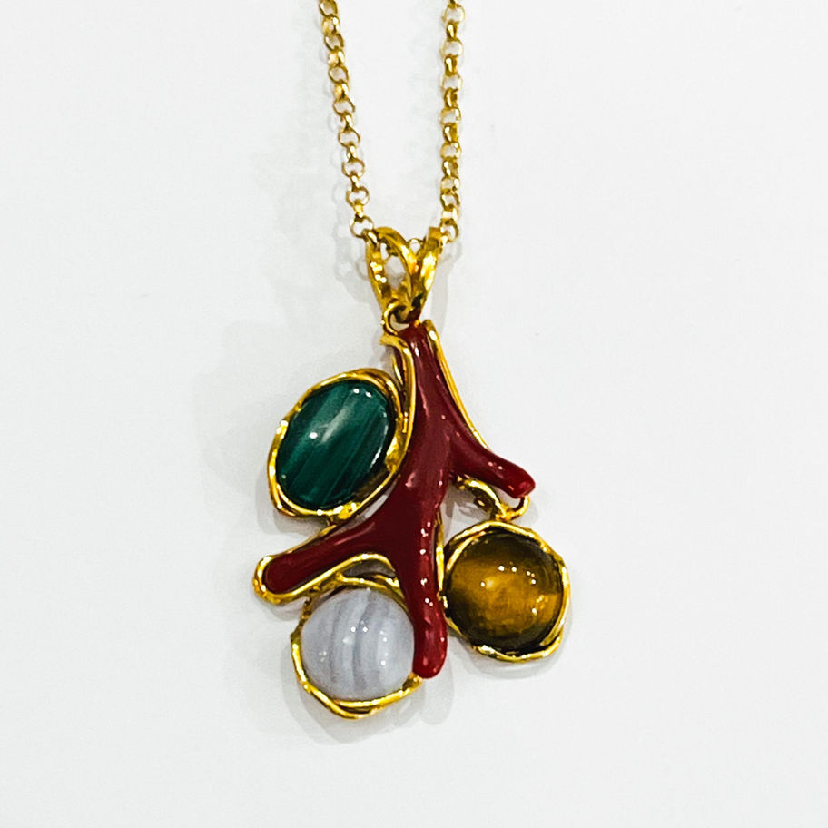 Collana in argento placcato oro corallo e pietre naturali
