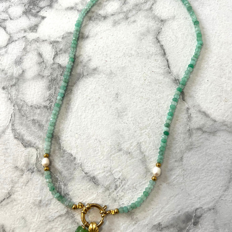 Collana realizzata a mano con perle coltivate, perline unarite, dettagli in acciaio placcato oro e ciondolo in zama.